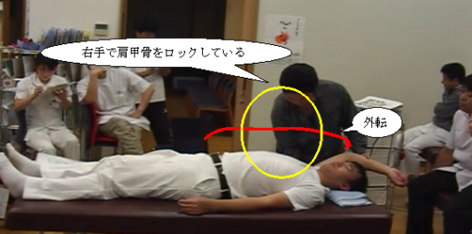 【複合外転テスト】 背臥位にて行い、肩甲骨下角を固定し、肩甲骨の動きを完全に取り除き、肩関節を外転させる。肩甲骨をロックした状態で、肩の可動性を見る。また小・中学生等のウェイトトレーニングのやり過ぎで、筋が固すぎる事が原因と疑ったときに使うこともできる。屈曲した際に肩が耳につかないようであれば異常である。